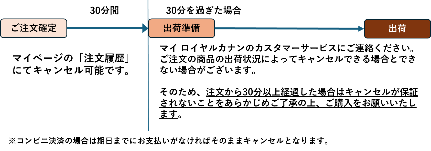 - ご注文後30分間、マイページの「注文履歴」にてキャンセルいただくことが可能です。※コンビニ決済の場合は期日までにお支払いがなければそのままキャンセルとなります。万が一、30分を過ぎてからキャンセルされたい場合は、お手数ですがマイ ロイヤルカナンのカスタマーサービスにご連絡ください。